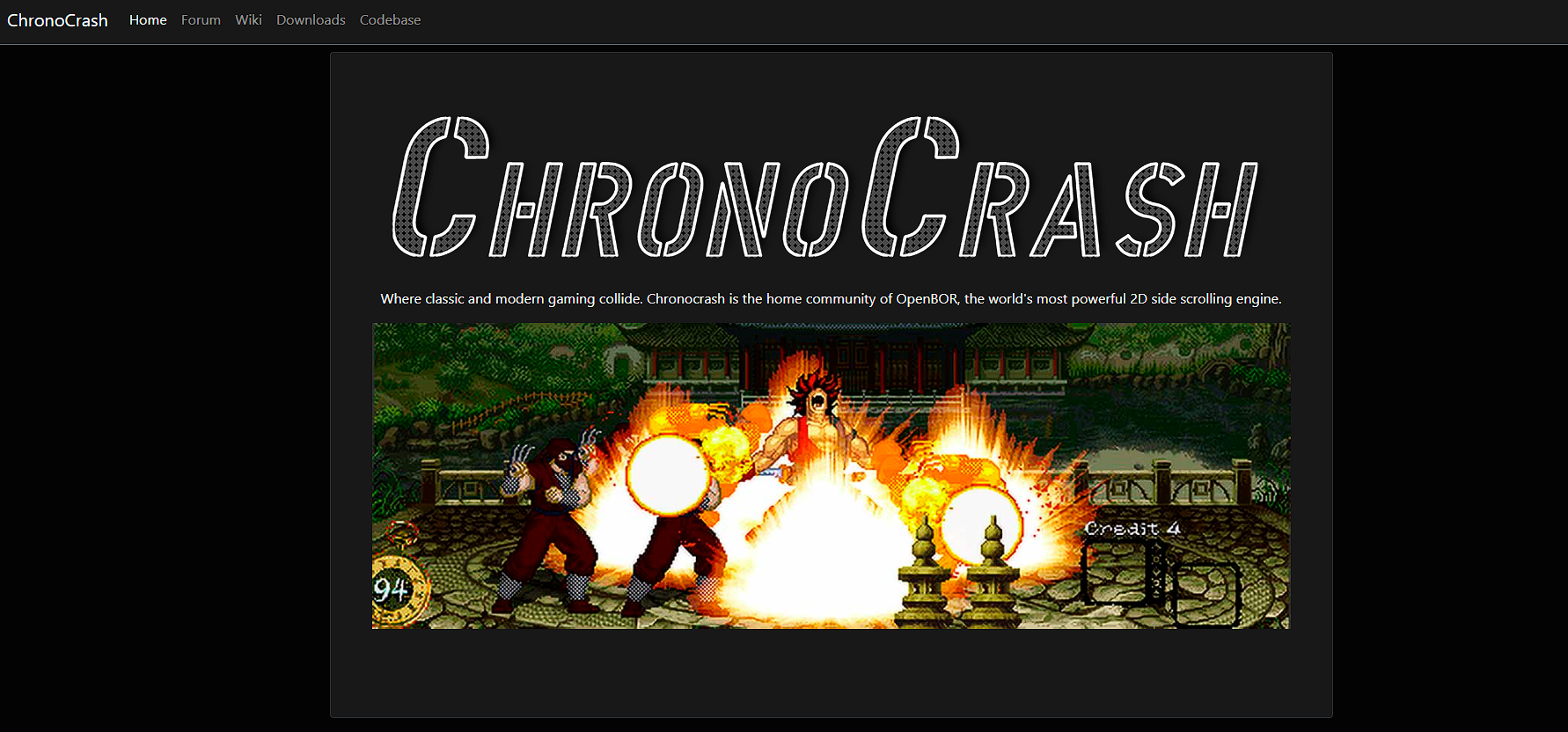 A ChronoCrash é uma comunidade de suporte para criadores independentes e entusiastas de jogos 2D, especialmente focada na engine OpenBOR, mas também com suporte para Mugen. No site, os usuários podem discutir desenvolvimento, baixar módulos, acessar a wiki do OpenBOR, buscar ajuda técnica e interagir em fóruns.