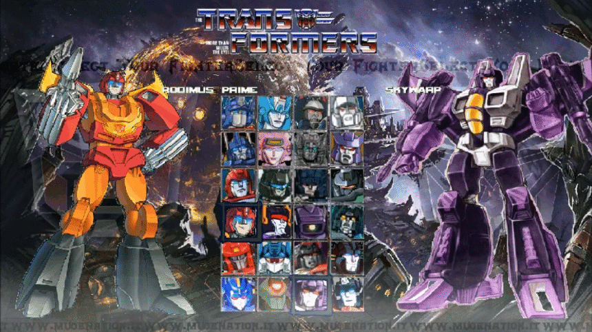 Transformers Mugenation Project 2021 retorna ao universo dos clássicos robôs dos anos 80 com um estilo retro único. Desenvolvido pela equipe Mugenation sob o comando de “Axander”, esse fã-game no motor MUGEN traz 24 lutadores emblemáticos, quatro cenários, incluindo dois inéditos criados especialmente para este título, e foi lançado oficialmente em 18 de janeiro de 2021, versão 1.0.0 para Mugen 1.1.