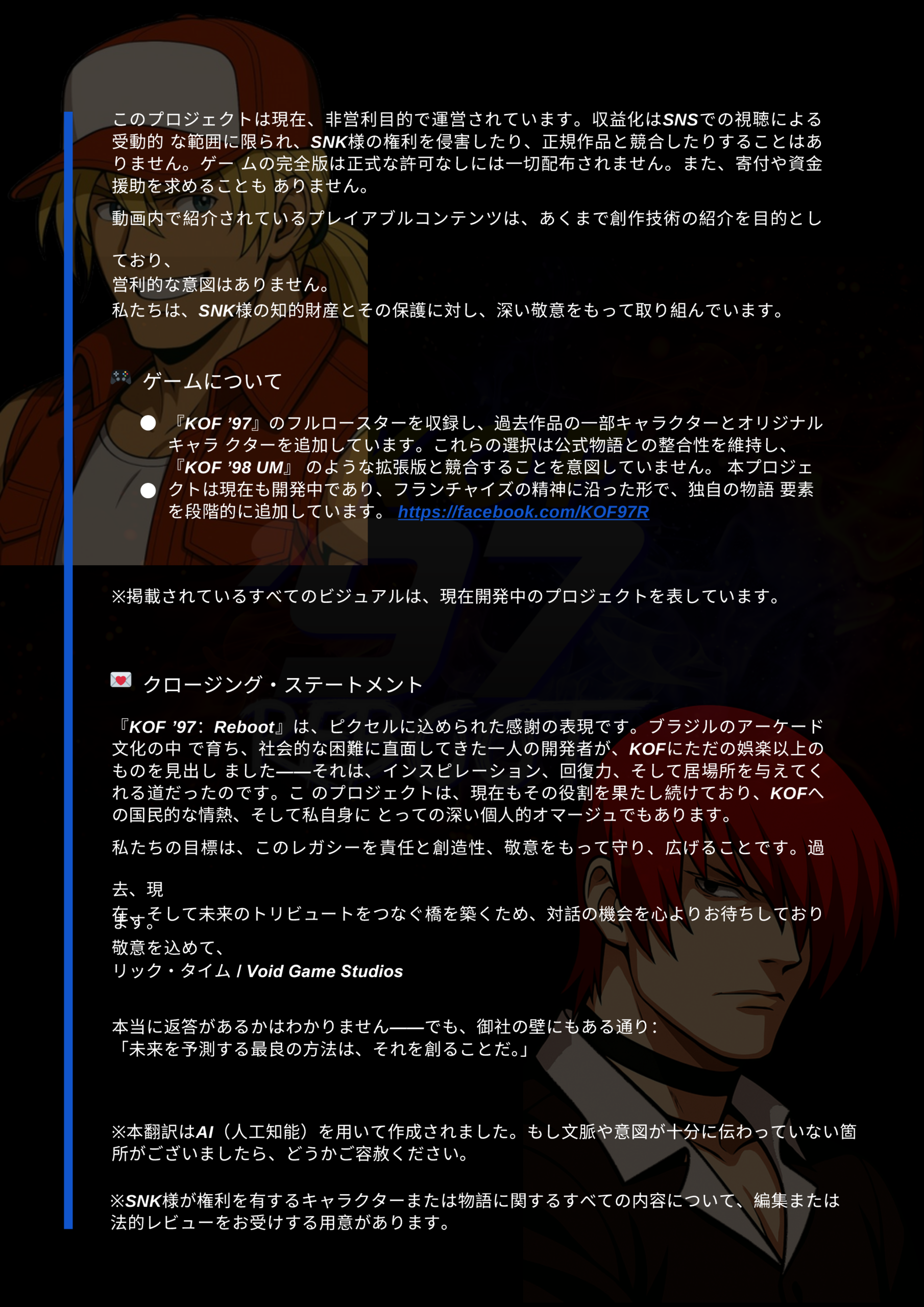 A equipe faz questão de reforçar sua posição ética: o projeto não aceita doações, não vende produtos e não distribui o jogo completo sem autorização. O pitch oficial, inclusive, foi enviado à SNK em inglês e japonês como forma de transparência e respeito institucional The King of Fighters’97 Reboot.