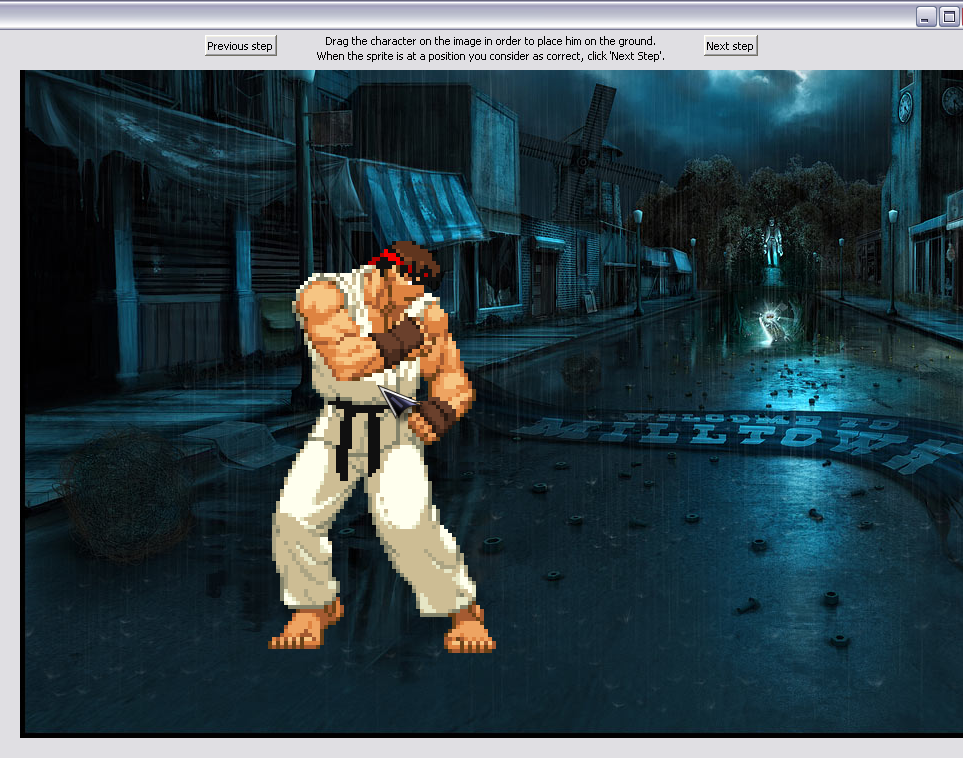 Arraste o ícone de personagem (frequentemente Ryu como exemplo) para definir a altura correta do “chão”. Isso posiciona a linha inferior do palco. Pode-se usar clique com o botão direito para auto‑detecção da base.